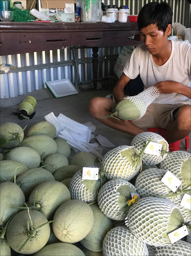 Thu hoạch dưa lưới và gắn nhãn hiệu. Ảnh: Tuệ Ninh