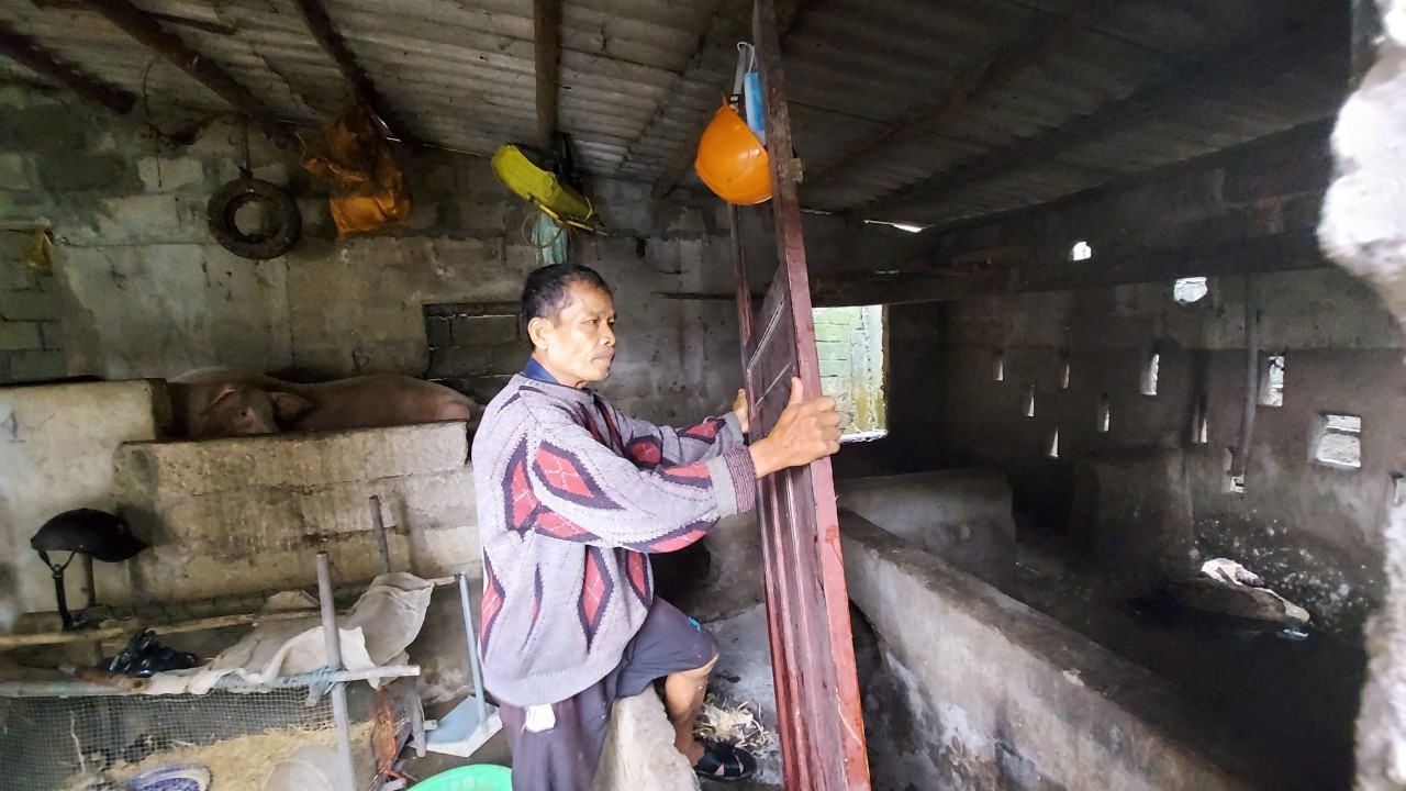 Ông Phan Ngưng chuẩn bị vật dụng kê chuồng, vận chuyển đàn lợn lên cao