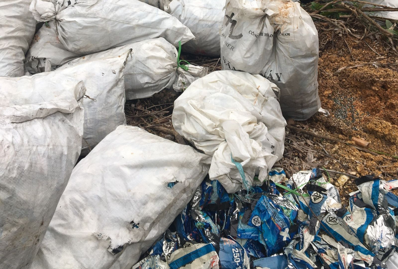 Người dân địa phương cho biết, những bao này chứa đồ thải xăm lốp cao su. Ảnh chụp vào ngày 11/1