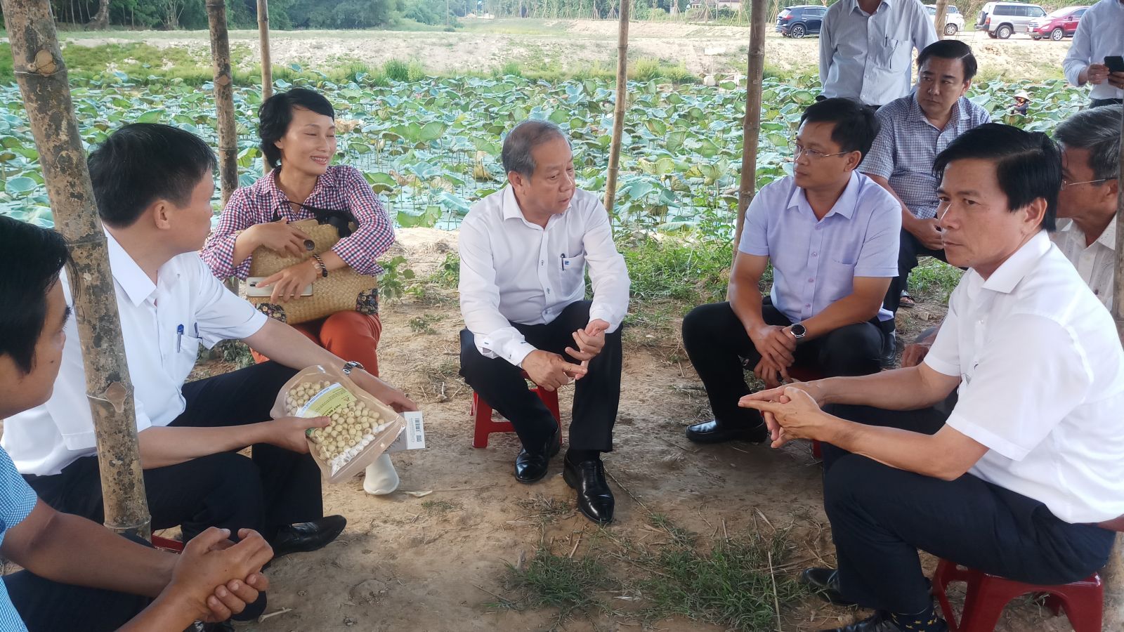 Chủ tịch UBND tỉnh Phan Ngọc Thọ (giữa) chỉ đạo các ngành, địa phương về việc xây dựng vùng sản xuất sen giống