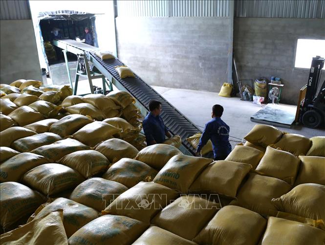 Vận chuyển gạo xuất khẩu tại Doanh nghiệp tư nhân Chế biến nông sản Quang Vũ, xã Phước Lộc, huyện Tuy Phước, tỉnh Bình Định. Ảnh: Vũ Sinh/TTXVN