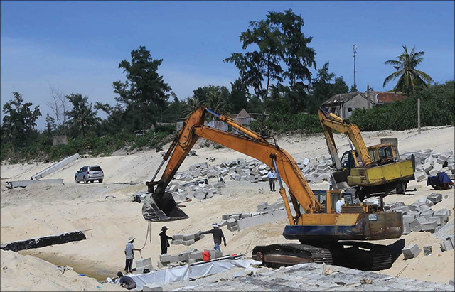 Thi công dự án kè chắn sóng ở xã Quảng Công. Ảnh: Tâm Huệ
