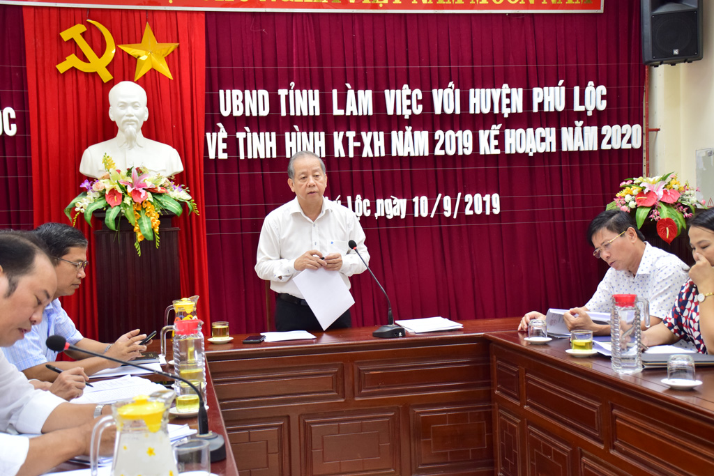 Phát biểu tại buổi làm việc, Chủ tịch UBND tỉnh Phan Ngọc Thọ yêu cầu, Phú Lộc là địa phương có thế mạnh, có đầy đủ các danh hiệu về khu kinh tế biển, vịnh đẹp thế giới, cảng nước sâu, vườn quốc gia... để phát triển kinh tế, xã hội. Vì vậy, Phú Lộc nắm lấy cơ hội để phát triển thành cửa ngõ phía nam, là đô thị mới theo định hướng của tỉnh. Sự phát triển của Khu kinh tế Chân Mây - Lăng cô và Vườn quốc gia Bạch Mã không thể tách rời với huyện Phú Lộc, tạo thành sức mạnh tổng thể.