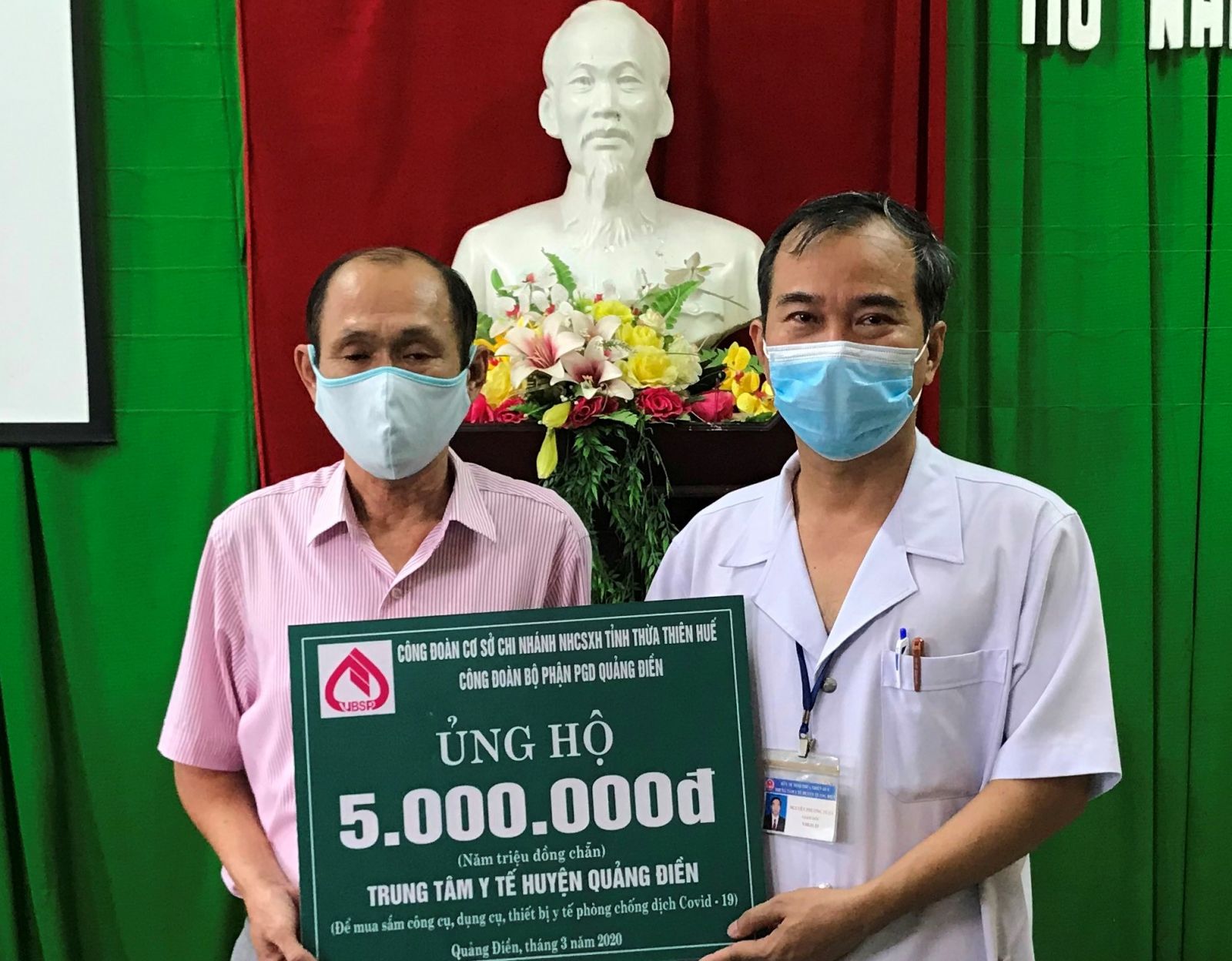 Cùng thời điểm, Ngân hành Chính sách xã hội huyện Quảng Điền đã phát động cán bộ, công nhân viên đóng góp kinh phí, trích ngày lương hỗ trợ phòng chống dịch. Theo đó, đơn vị đã hỗ trợ 5 triệu đồng cho Trung tâm Y tế huyện Quảng Điền góp phần phòng chống dịch bệnh COVID-9. Trước đó, Ngân hàng Chính sách xã hội huyện Quảng Điền cũng đã trích ngày lương của cán bộ, nhân viên để hỗ trợ phòng chống dịch bện COVID-19 và chống thâm nhập mặn ở đồng bằng sông Cửu Long.