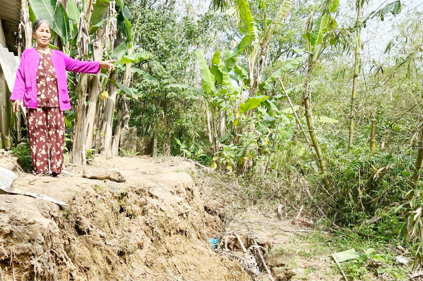 Chỉ tay về phía một bụi tre lớn đã nằm gọn ở lòng sông chỉ còn nhô ngọn lên mặt nước, ông Phạm Ba cho biết: “Mấy năm trước trời mưa lũ mới sạt lở ít, nhưng không hiểu sao năm nay tình trạng sạt lở xảy ra dữ dội, ăn sâu vào nhà mấy chục mét, với hàng trăm khối đất bị cuốn trôi xuống sông, nuốt một phần diện tích đất nông nghiệp rồi làm cho nhà bếp chực đổ xuống sông. Nhà lớn cũng bị nứt toác do sạt lở ăn sâu vào sát nhà với khối lượng lớn, rất nguy hiểm. Vợ chồng già chúng tôi chỉ mong muốn chính quyền xã sớm làm kè chống sạt lở để chúng tôi đỡ lo, an tâm dưỡng già”.