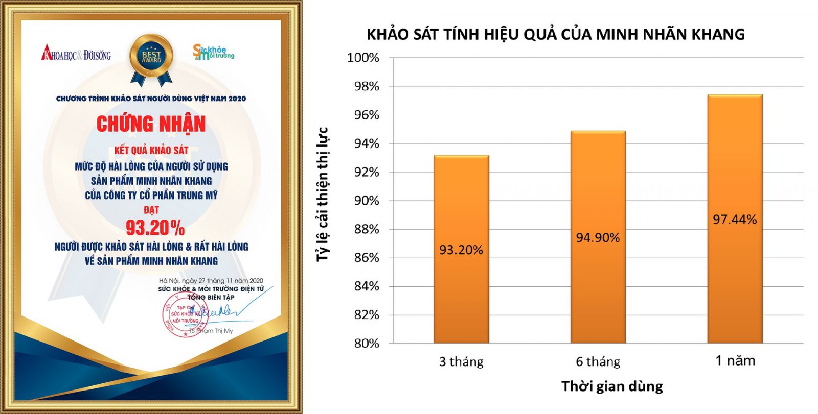 Ngoài ra, theo khảo sát thực tế của Báo Khoa học & Đời sống cùng tạp chí Sức khỏe & Môi trường, có trên 93% người dùng Minh Nhãn Khang cảm thấy rất hài lòng về sản phẩm. Sau 3 tháng, thị lực của họ đã tốt lên rõ rệt, các biểu hiện nhìn mờ nhòe, chấm đen, chói sáng, nhức mỏi, khô cộm đều giảm hẳn. Đồng thời, các bệnh về mắt được ngăn chặn kịp thời và tránh được nguy cơ biến chứng sau khi phẫu thuật mắt. Cùng tìm hiểu thêm thông tin TẠI ĐÂY.