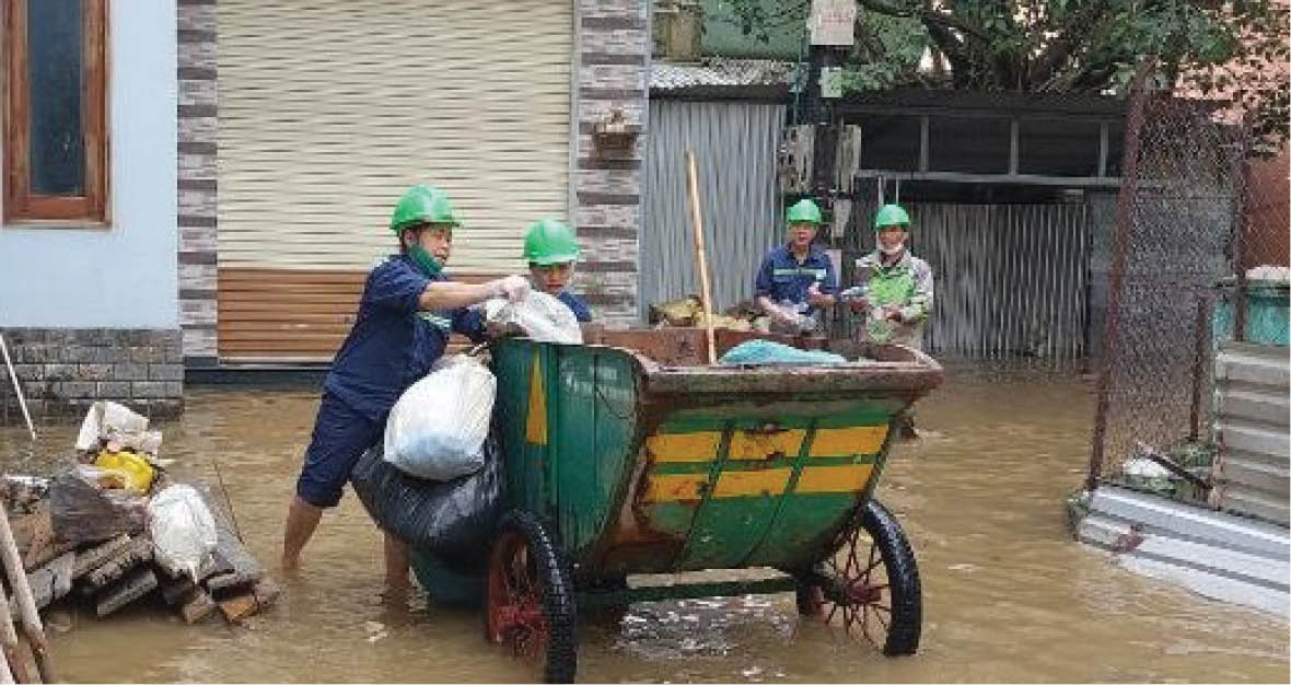 Nhiều tuyến phố còn ngập nước lũ nhưng công nhân HEPCO vẫn tiến thu gom, xử lý rác thải sinh hoạt