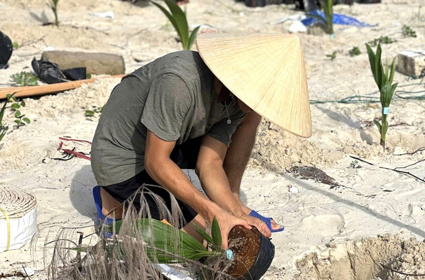 | Một người dân địa phương chăm chút trồng dừa giống trên các triền cát ở thôn Hải Nhuận và Hải Phú (Phong Hải) |