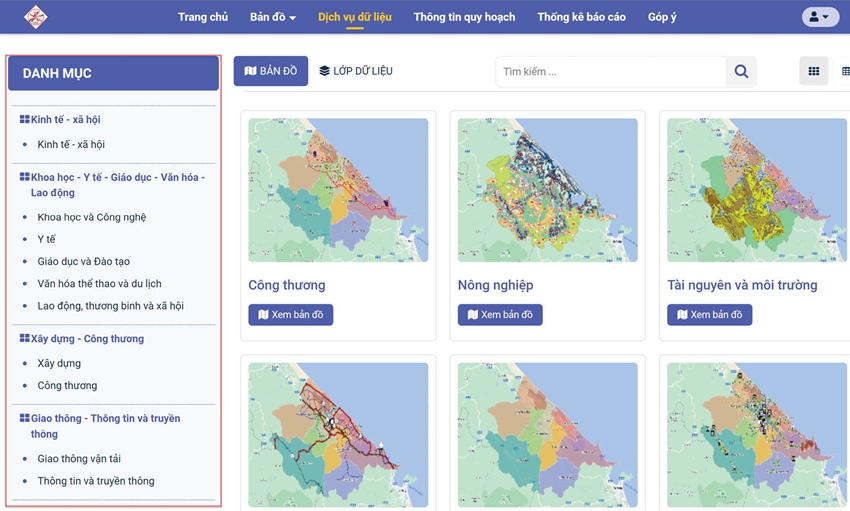 Các nhóm dữ liệu chính của hệ thống, bao gồm: Tổng hợp quy hoạch, di sản, kinh tế - xã hội, văn hóa - thể thao và du lịch, xây dựng, công thương, nông nghiệp, tài nguyên và môi trường, giao thông vận tải, thông tin và truyền thông, khoa học và công nghệ, y tế, giáo dục và đào tạo, lao động, thương binh và xã hội, quốc phòng và an ninh, ngoại giao và kèm theo đường link liên kết đến trang khai thác dữ liệu tương ứng. Ngoài ra, phần mềm này còn cung cấp các dịch vụ dữ liệu khác...