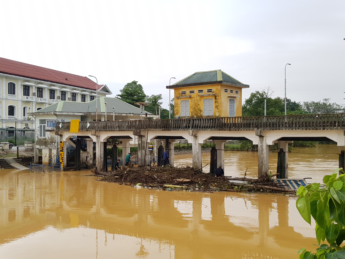 Nước ngập ở trạm ngăn mặn Phủ Cam trong trận lụt tháng 10/2020