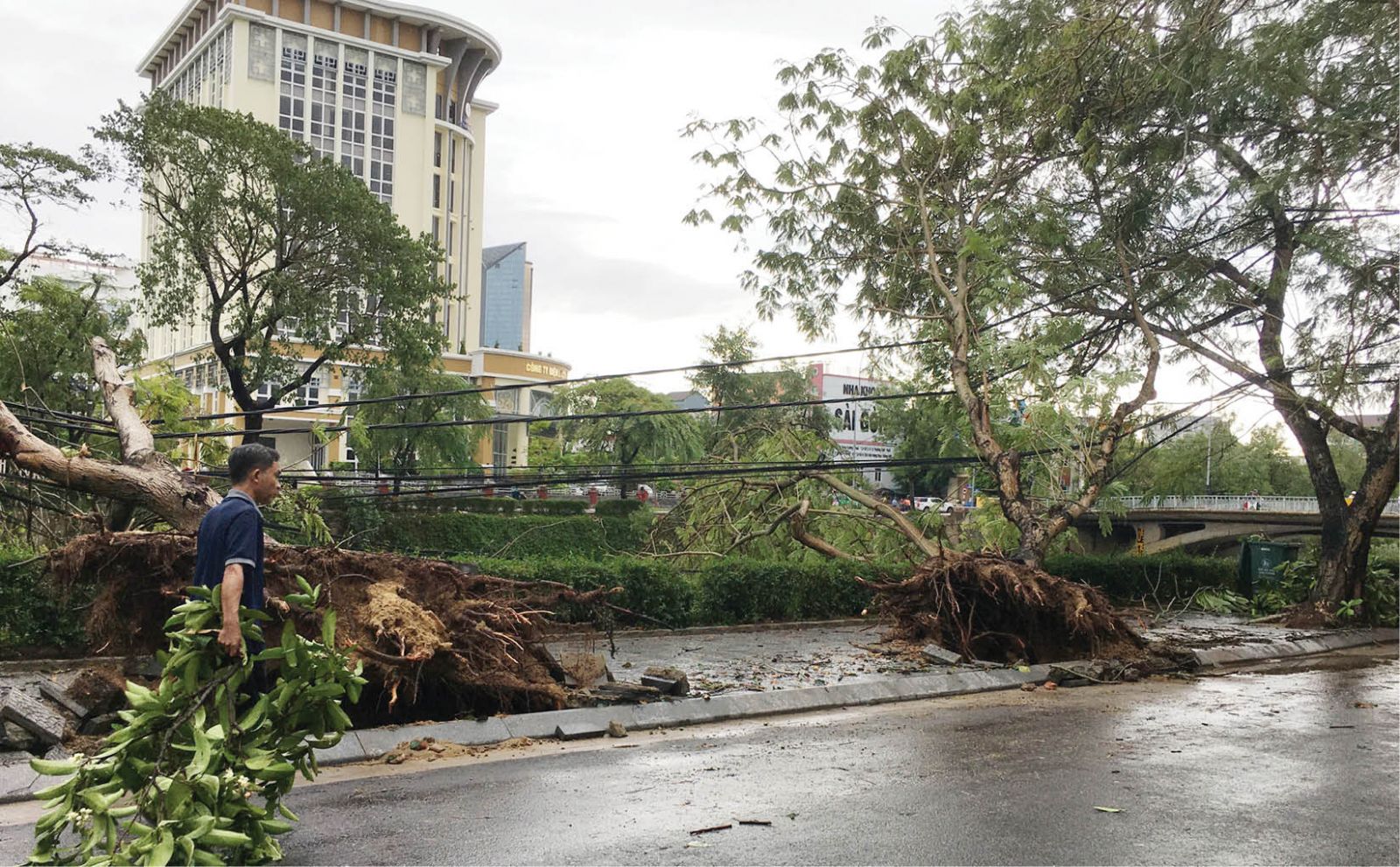 Rất nhiều cây xanh trên đường Phan Chu Trinh bị bật gốc, tướt cành trong cơn bão số 5. Ảnh HK