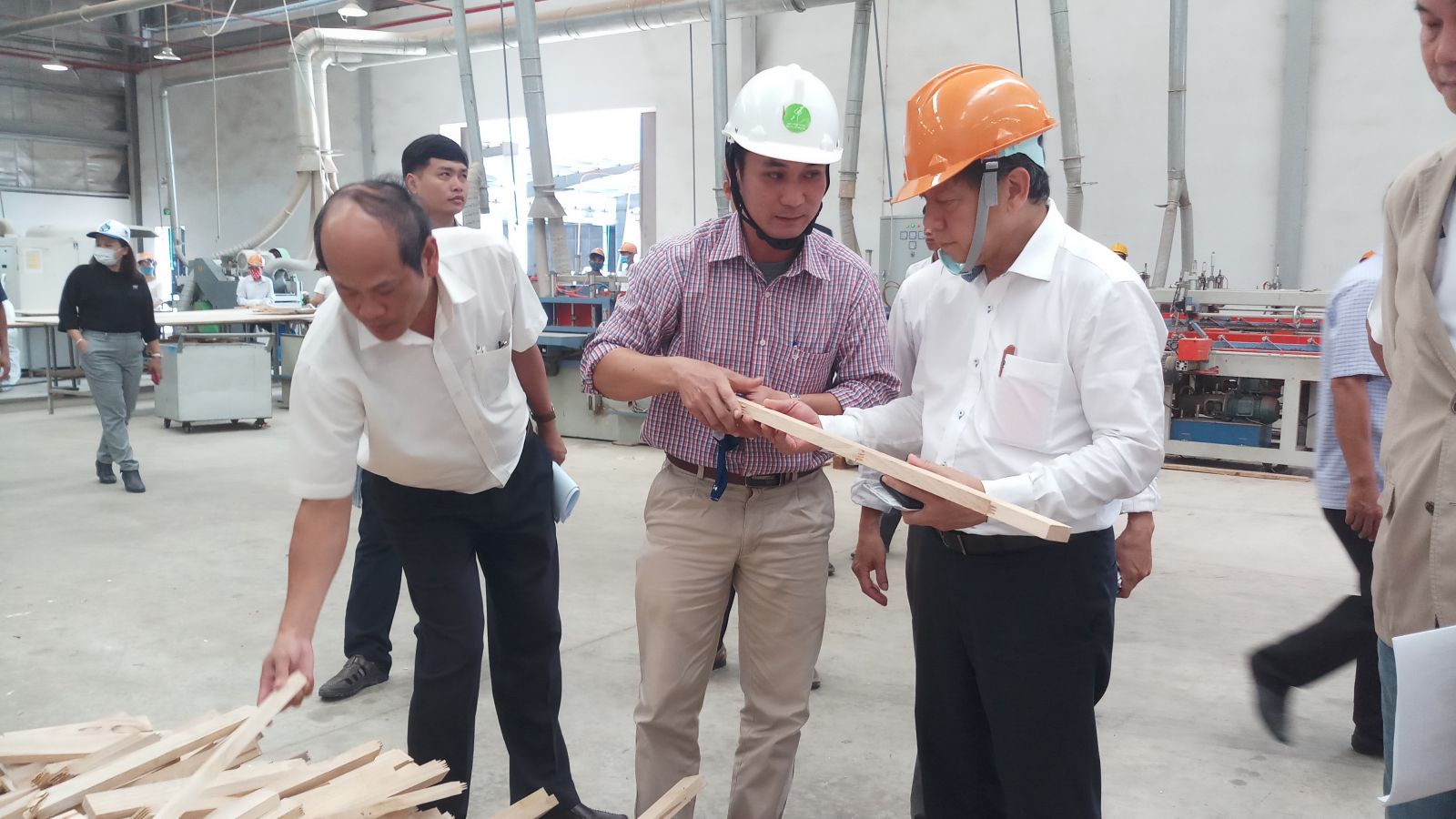 Chủ tịch UBND tỉnh Phan Ngọc Thọ xem sản phẩm gỗ của Công ty TNHH Lee & Park Wood Complex tại khu công nghiệp Phong Điền