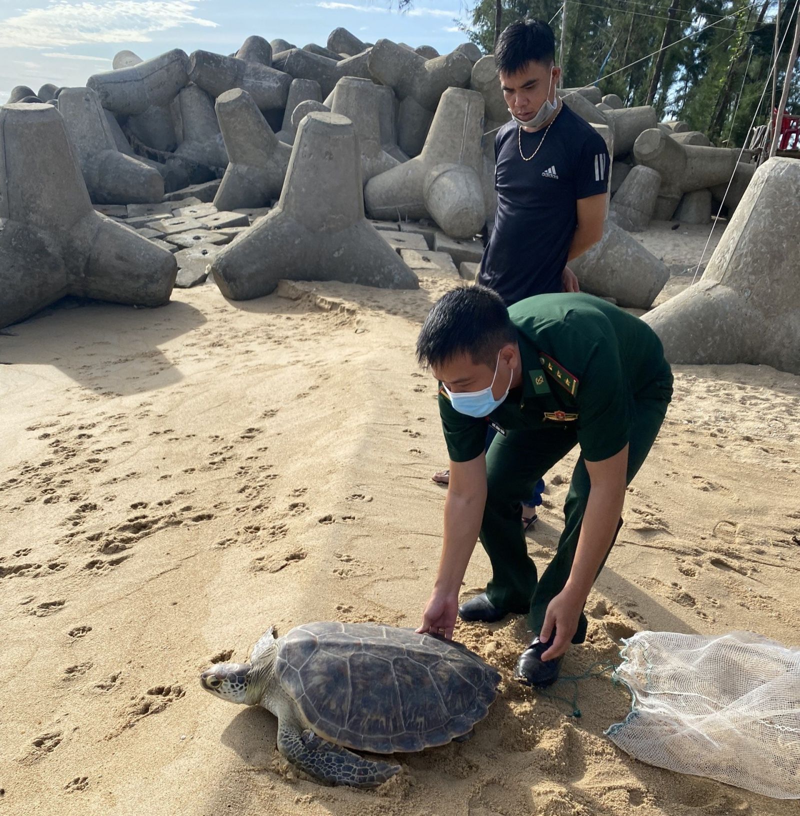 Thượng úy Chế Công Tuấn cùng ngư dân thả rùa về môi trường tự nhiên