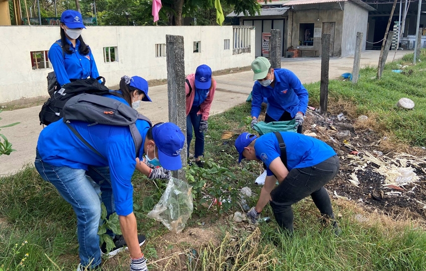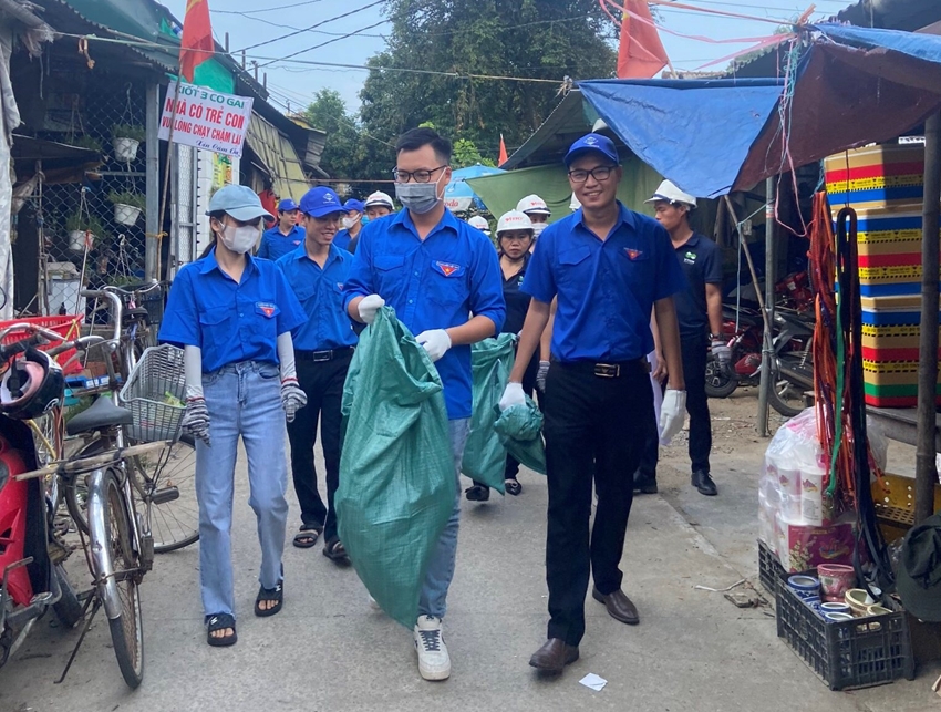 | Đoàn viên, thanh niên địa phương tham gia nhặt rác ở khu chợ |