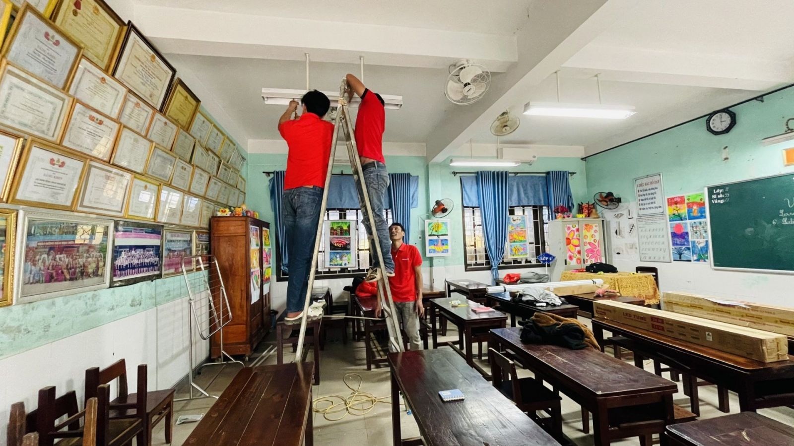 Các kỹ thuật viên không quản ngày đêm để hoàn thành hệ thống chiếu sáng Điện Quang bảo vệ đôi mắt cho cả thầy và trò tại các trường học (lấy hình này làm hình thumb)