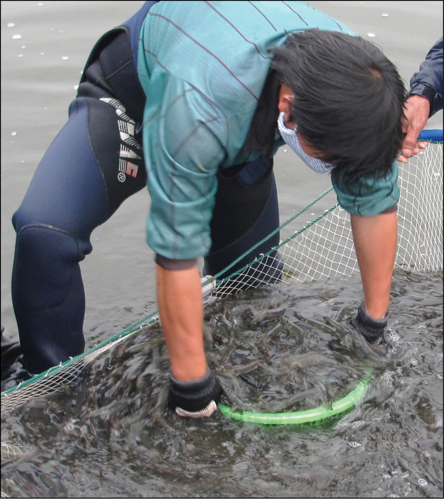 Người nuôi tôm xã Phong Hải dùng rớ kiểm tra kích cỡ tôm