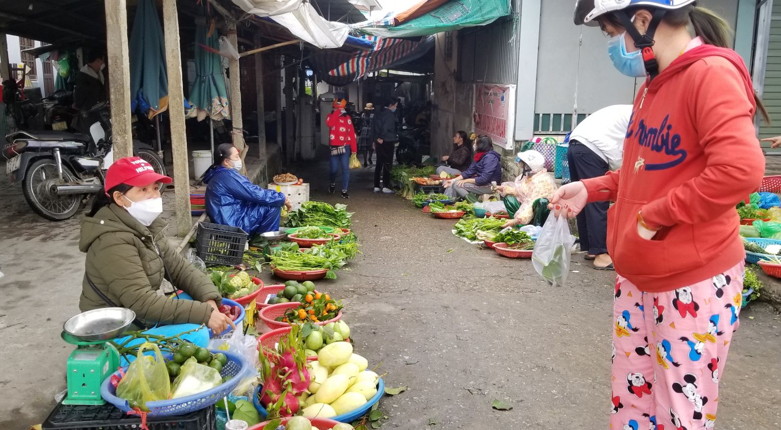 Gánh hàng rau trái của dì Viên vẫn còn đầy rổ dù đã trưa chợ. Dì Viên trò chuyện: "Mấy trái bầu, rau khoai nhà, vả, chanh... ni toàn của nhà trồng. Dì để dành đợi ra tết mang đi bán để được giá hơn. Nhưng mấy ngày ni do trời mưa lạnh, nhiều người nhác đi chợ, chứ mọi năm hàng ni quý lắm, dì bán hết liền".