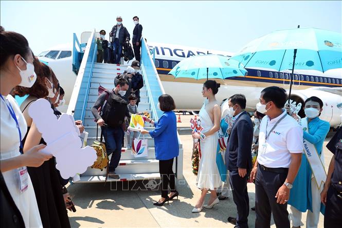 Những vị khách quốc tế từ Singapore đến Đà Nẵng được chào đón tại sân bay quốc tế Đà Nẵng ngày 27/3/2022. Ảnh: Trần Lê Lâm/TTXVN.