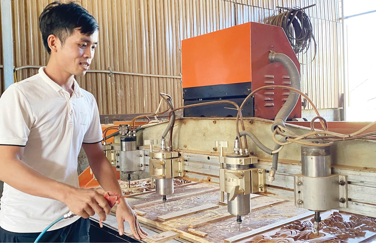 Nhanh nhạy vận hành chiếc máy điêu khắc gỗ có giá hơn 150 triệu đồng này, anh phân tích: “Nhờ máy điêu khắc, không chỉ công lao động giảm mà mẫu mã cũng được mình cập nhật để bắt kịp xu thế. Quan trọng nhất là dù có sự trợ sức từ máy móc, mình vẫn hoàn thiện những phần chạm khắc, đục đẽo tinh vi hoặc làm nổi hoa văn bằng tay. Bởi thế sản phẩm làm ra nhanh, nhưng vẫn đạt chất lượng cũng như thẩm mỹ”.