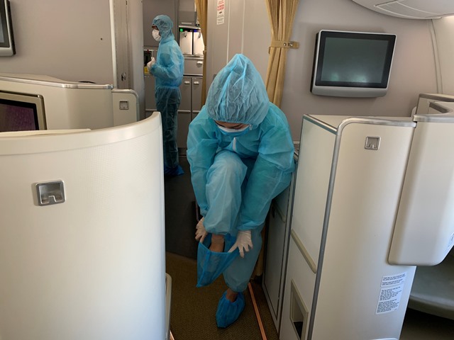 Phi hành đoàn sẽ làm việc trên chuyến bay hơn 10 tiếng đồng hồ trong trang phục này. Việc vệ sinh, giao tiếp, đi lại bị hạn chế để giảm thiểu nguy cơ lây nhiễm.