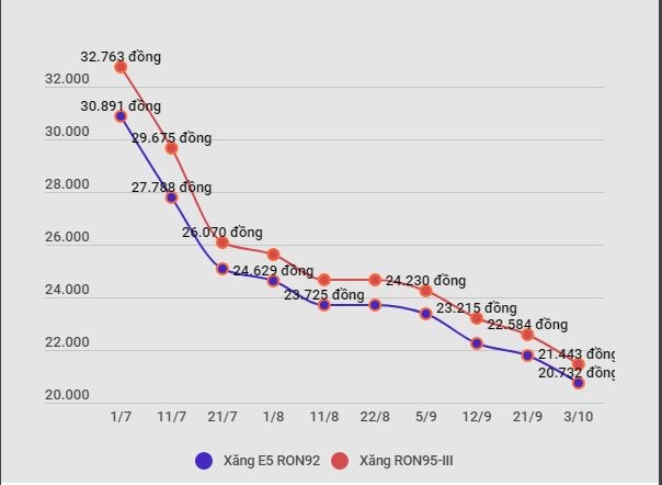 Trong lần điều chỉnh gần nhất (ngày 3/10), mức trích lập quỹ bình ổn đối với xăng E5 RON92 ở mức 451 đồng/lít, xăng RON95 là 600 đồng/lít, dầu diesel và dầu hỏa là 300 đồng/lít, còn mazút là 741 đồng/kg, nhờ đó xăng RON 95-III giảm 1.141 đồng, về mức 21.443 đồng; xăng E5 RON92 có giá mới là 20.732 đồng, giảm 1.049 đồng/lít.
