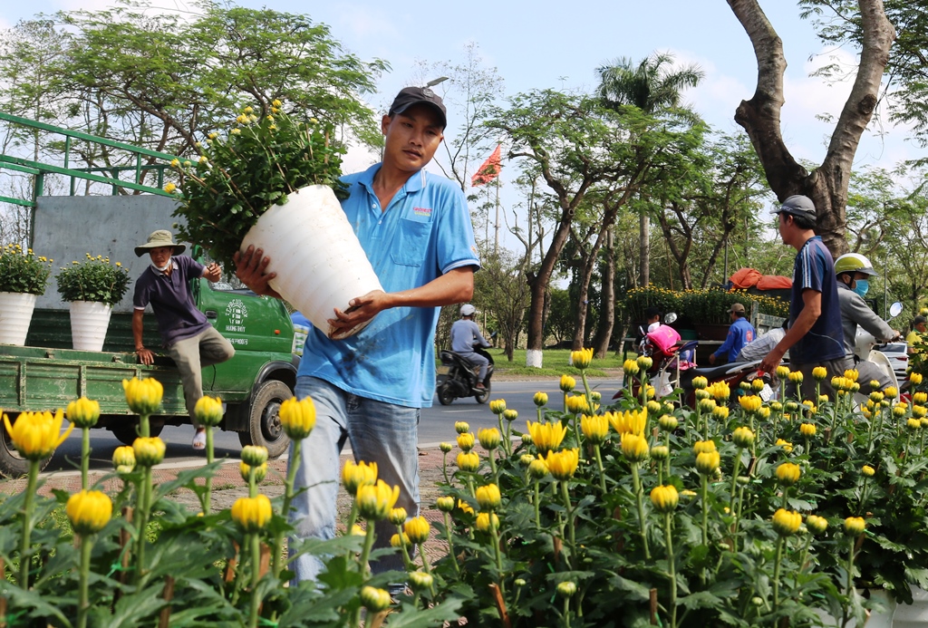 Ba khu chợ hoa xuân trên đường Lê Duẩn, khu đô thị An Cựu City và phía trước Trung tâm Thể thao tỉnh sáng 1/2 rất đông chủ các lô hàng đưa hoa đến sắp xếp