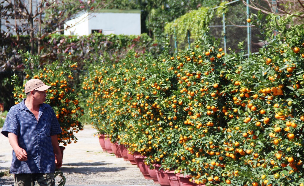 Hàng trăm chậu quất được đưa ra từ Hội An xếp thành hàng chờ khách