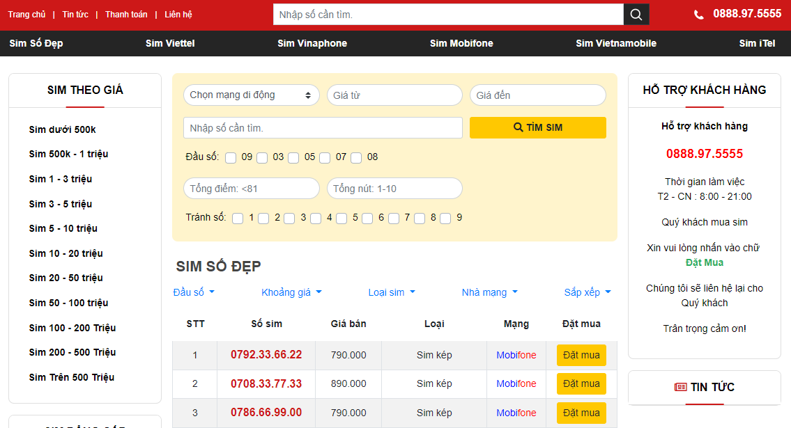 Simhuyenmy.com sở hữu kho sim khổng lồ lên tới hàng triệu thẻ sim đẹp, chất lượng. Tại đây, người dùng có thể dễ dàng tìm kiếm tất cả thẻ sim tới từ các nhà mạng khác nhau như Vinaphone, Vietnamobile, Viettel, iTelecom, Mobifone,...với đa dạng đầu số. Trong suốt những năm qua, trang web đã đáp ứng được nhu cầu tiêu dùng của hàng triệu khách hàng.