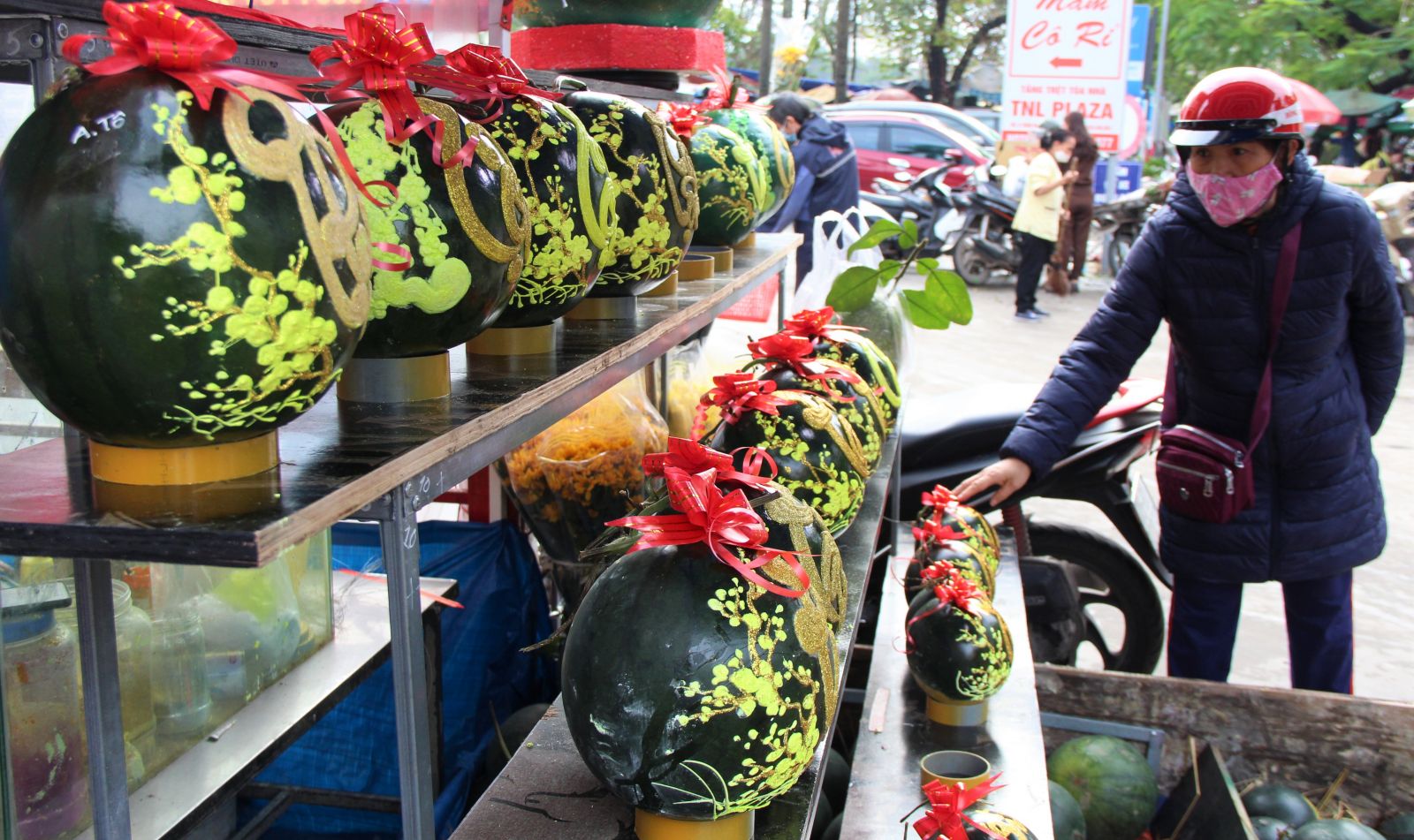 Dưa hấu được trang trí, tạo hình đẹp mắt được rao bán từng 150.000 - 350.000 đồng/quả tùy theo kích cỡ
