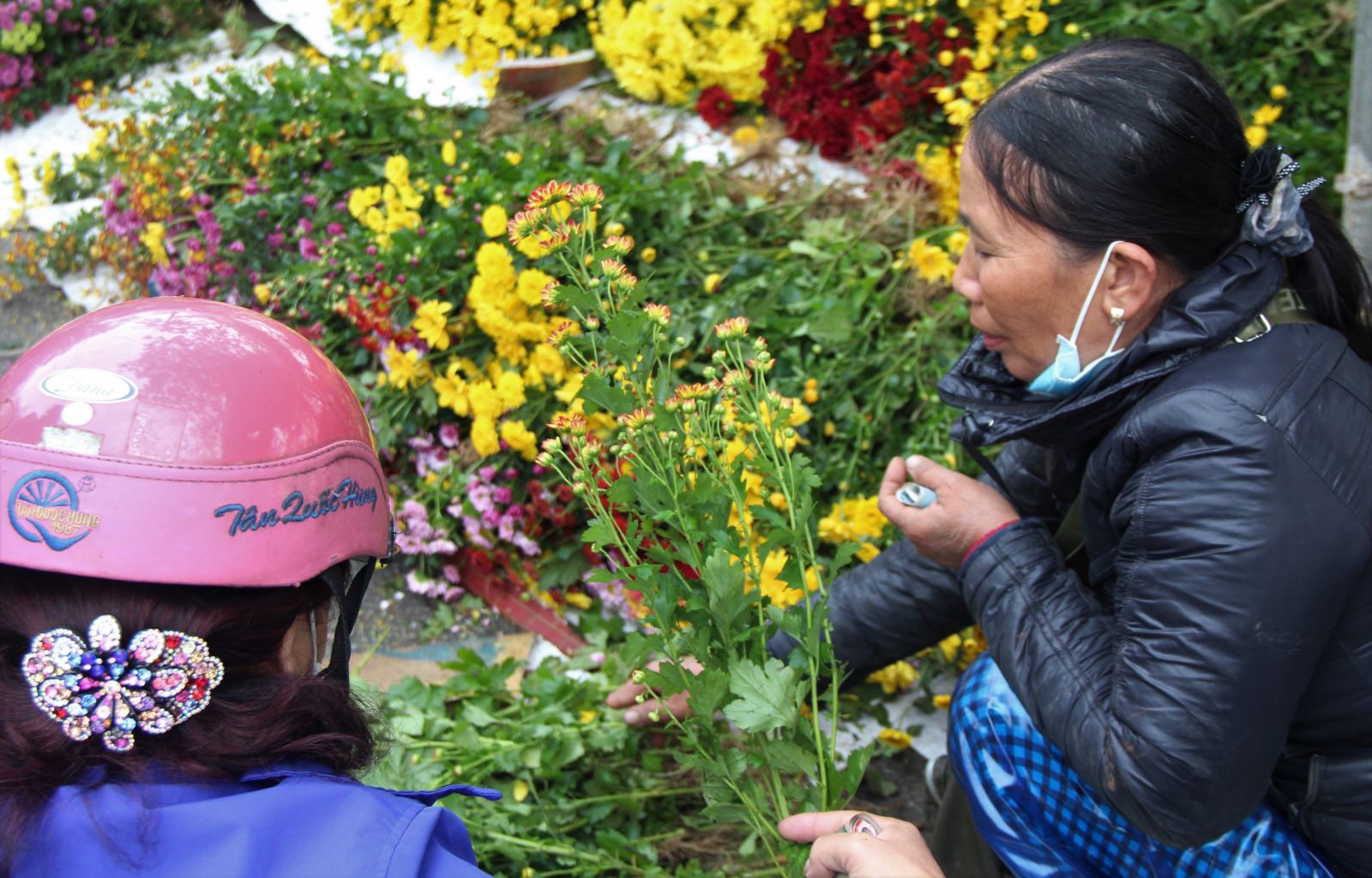 Theo ghi nhận, khu bán hoa cắt cành cắm tết và các loại trái cây tập trung nhiều nhất ở phía mặt sau chợ Đông Ba, trên đường Chương Dương. Từ sáng sớm, dòng người từ nhiều nơi nối đuôi nhau về đây tìm mua những loại trái cây, bó hoa ưng ý nhất nhưng vừa túi tiền.