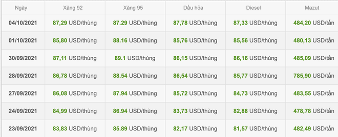 Mới đây nhất, hôm 25/9, giá xăng E5 RON 92 được điều chỉnh tăng 573 đồng/lít, xăng RON 95 tăng 548 đồng/lít. Các loại dầu cũng tăng giá, trong đó dầu diesel tăng 564 đồng/lít, dầu hỏa tăng 561 đồng/lít; dầu mazut tăng 628 đồng/kg.