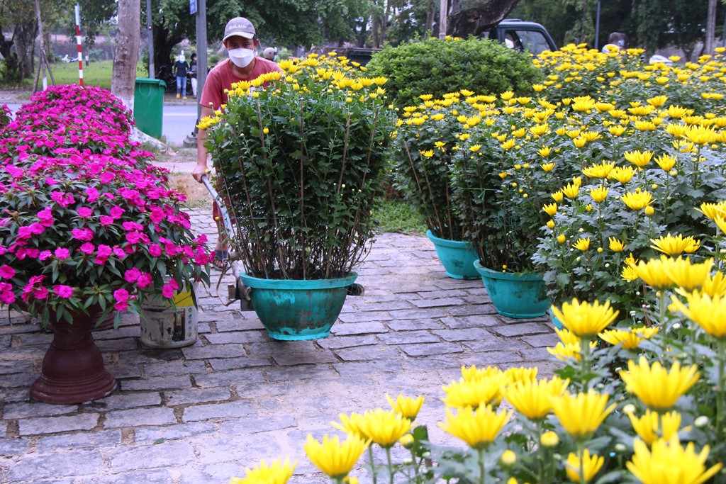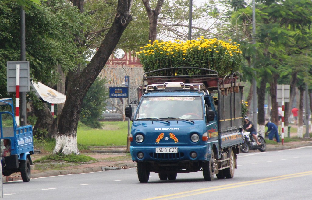 Không khó để bắt gặp cảnh các xe vận chuyển hoa trên các tuyến đường những ngày này. Hoa từ miền Nam chuyển ra, miền Bắc chuyển vào, hoa từ các vùng ngoại ô Huế chuyển lên. Sắc hoa nổi bật nhất ở các khu bày bán hoa vẫn là hoa cúc với màu vàng đặc trưng. Theo khảo sát, giá thời điểm này khoảng 300.000 đồng/cặp, cặp lớn từ 600.000 đồng đến vài triệu đồng.