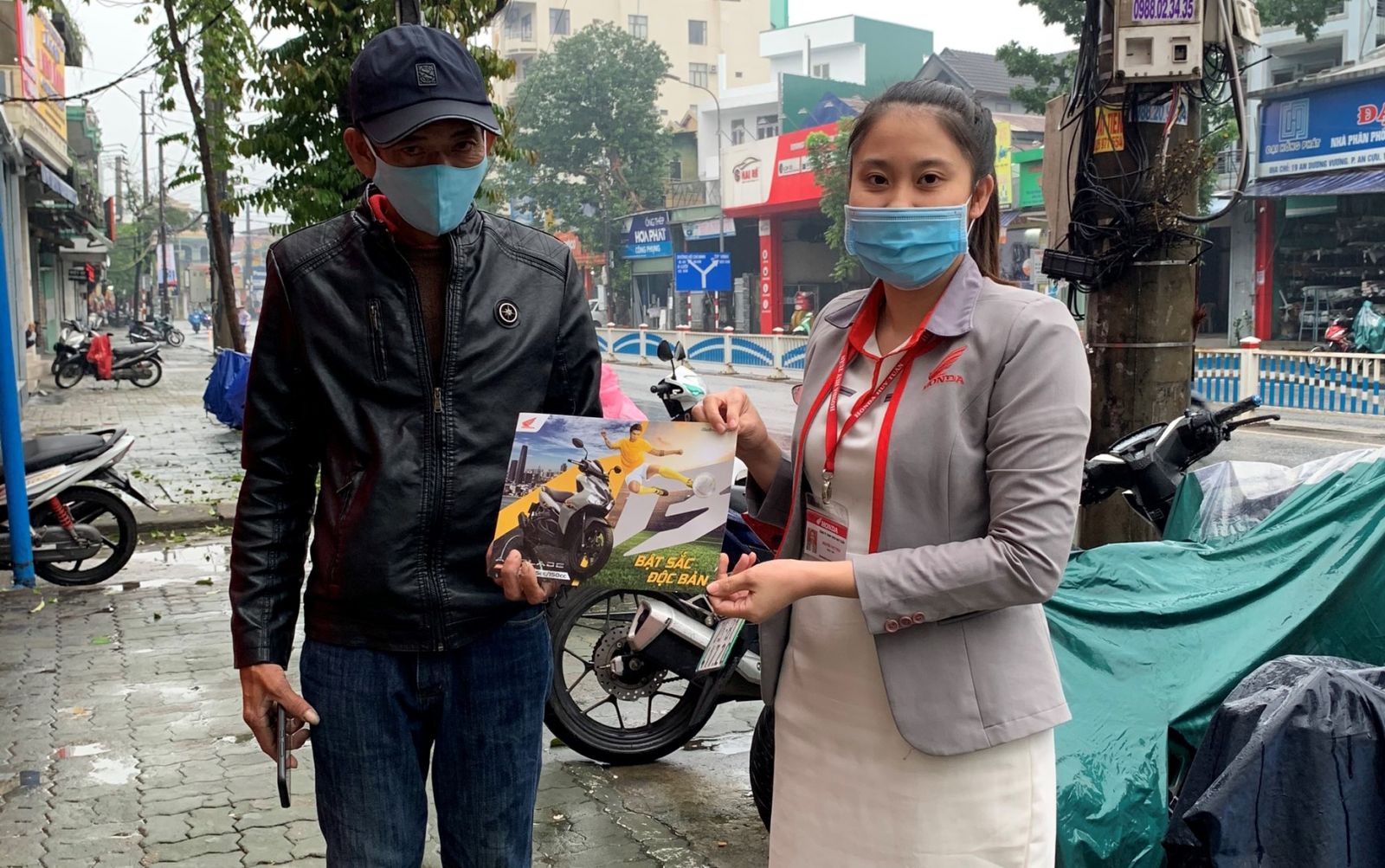Đại diện công ty phát tờ rơi và giới thiệu các chương trình khuyến mãi đến khách hàng