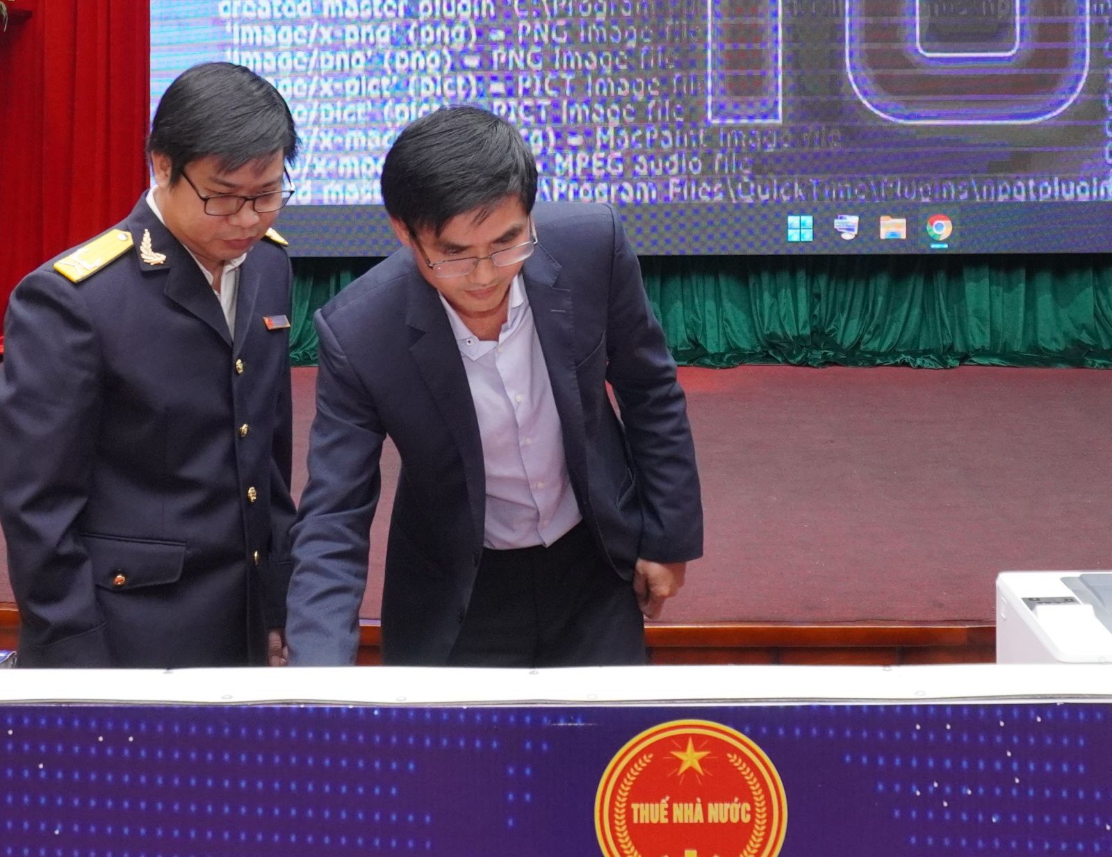Ông Nguyễn Quốc Cường, Phó Giám đốc Sở Tài chính, Chủ tịch Hội đồng giám sát đã thực hiện bấm nút lựa chọn hóa đơn may mắn quý IV/2022. Theo đó, giải nhất sẽ được trao cho: Quầy thuốc Phương Thùy, các giải khác sẽ được công khai trên Cổng thông tin điện tử của Cục Thuế.