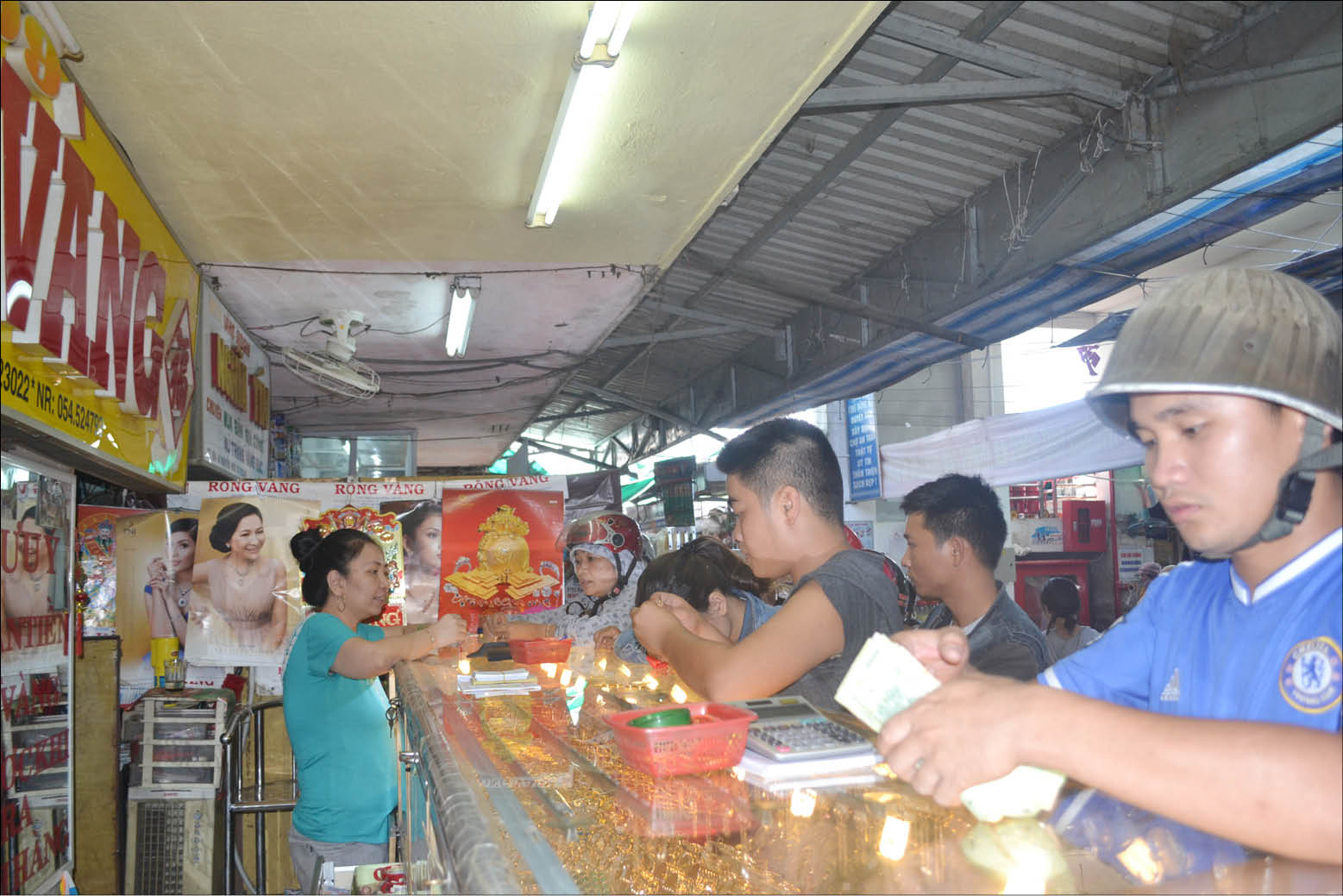 Tại tiệm vàng Rồng Vàng, thuộc ki ốt nhà A, chợ Đông Ba, phường Phú Hòa (Huế), lúc 9h30 sáng 25/6 có khoảng gần 20 khách hàng đến mua bán, giao dịch. Trong đó có khá nhiều khách hàng mua vàng.