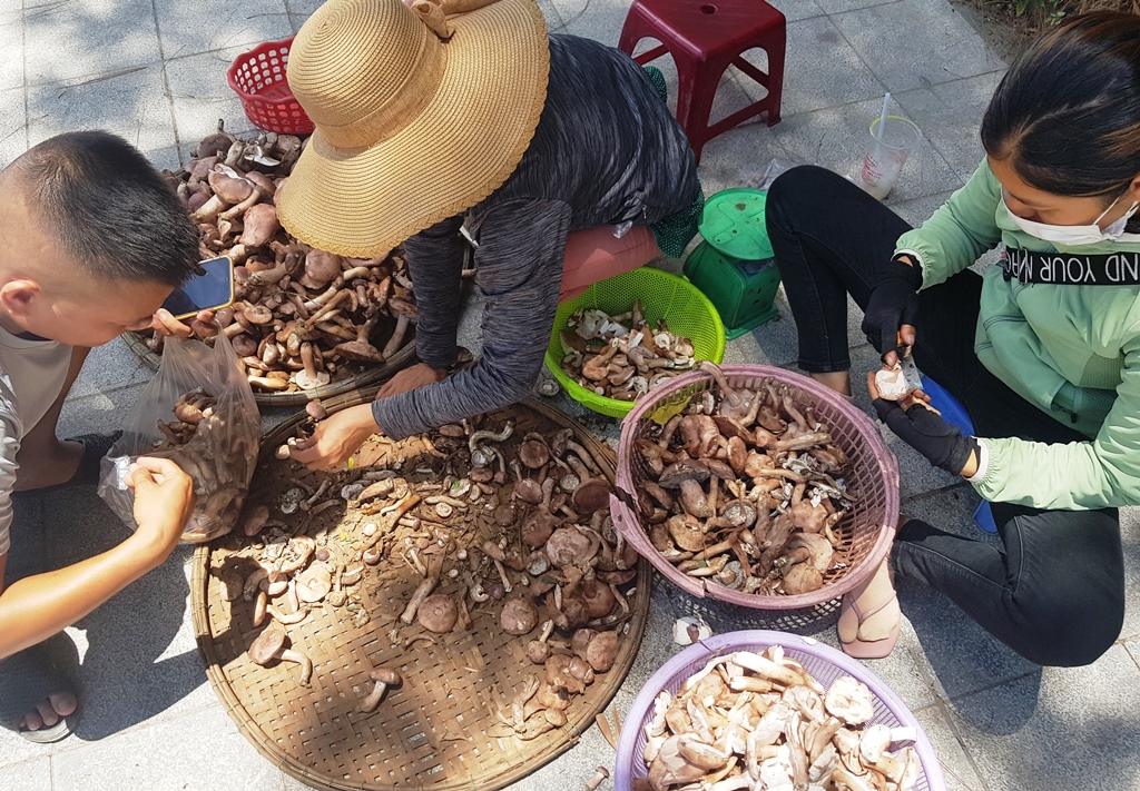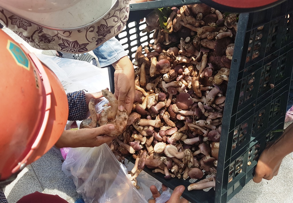 Không khó để bắt gặp những thùng nấm lớn được bà con nâng niu chở bằng xe máy sau khi hái ở trong rừng để bày bán. Hơn 11h trưa, lần lượt hết xe này đến xe khác về đến chợ nấm, rồi lần lượt đổ ra những rổ lớn, cạnh đó nhiều người mua đã đứng chờ.
