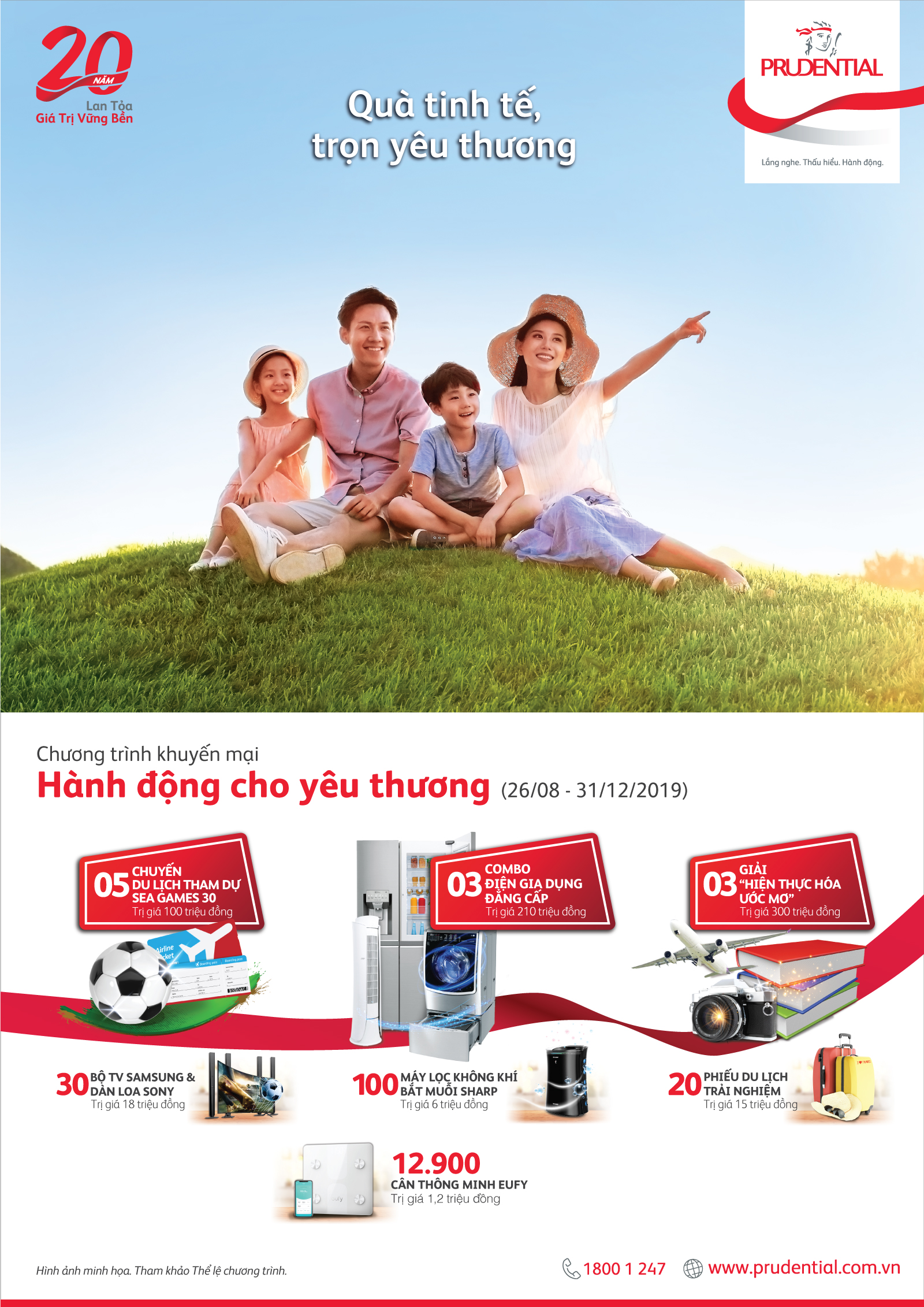 Từ ngày 26/08 đến ngày 31/12/2019, Công ty TNHH Bảo hiểm Nhân thọ Prudential Việt Nam (Prudential) triển khai chương trình khuyến mại “Hành động cho yêu thương”, áp dụng cho các khách hàng tham gia mới các sản phẩm bảo hiểm nhân thọ của Prudential trên toàn quốc. Tham gia chương trình, khách hàng có cơ hội nhận được những giải thưởng hấp dẫn với tổng trị giá lên đến 19 tỷ đồng.