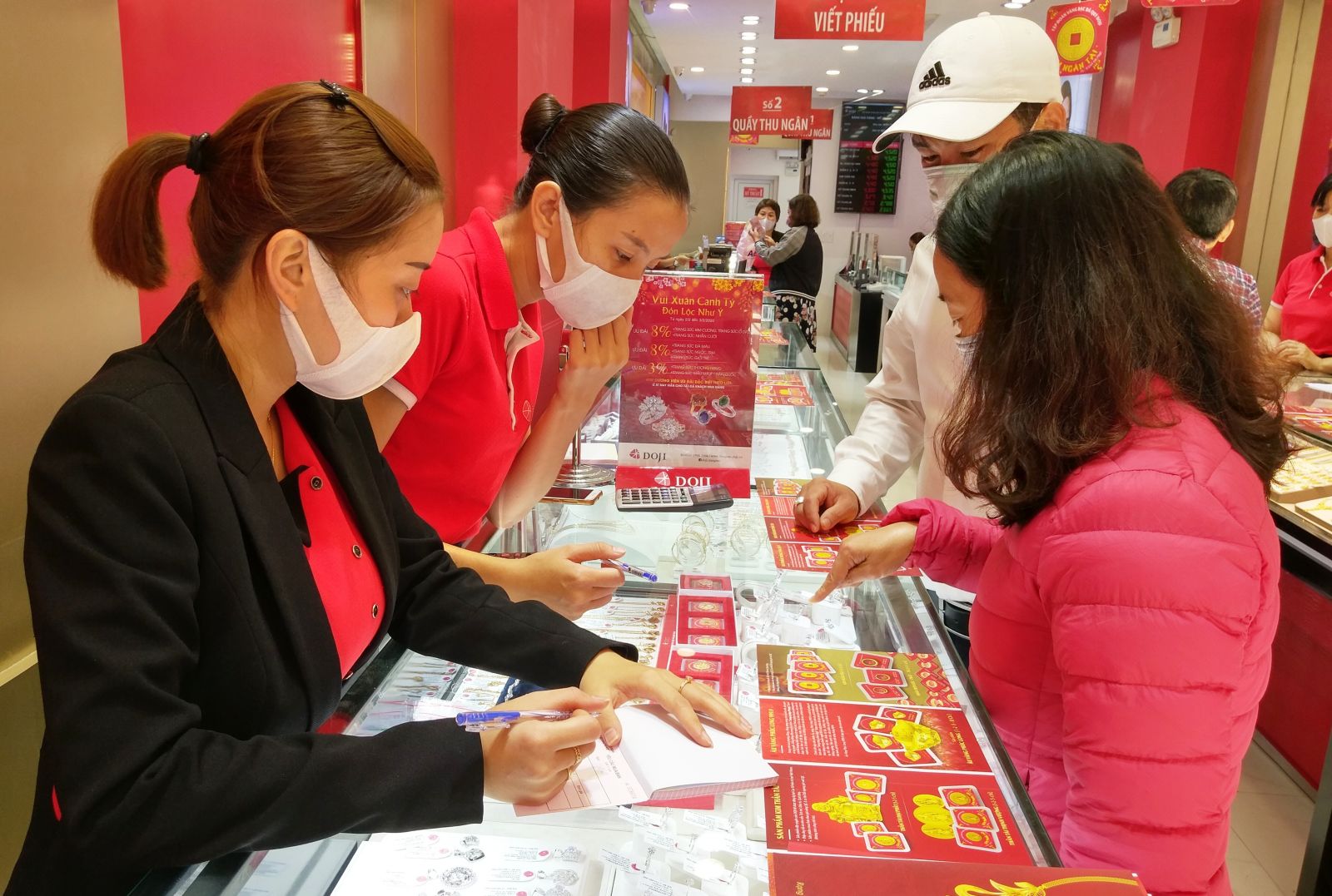 Khách hàng cùng nhân viên đều đeo khẩu trang khi mua vàng Tập đoàn Vàng bạc đá quý DOJI-Chi nhánh Huế (đường Trần Hưng Đạo)