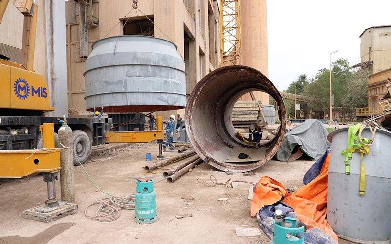 Thi công cải tạo dây chuyền xi-măng tại Vicem Hoàng Mai.