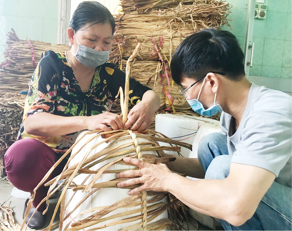 Mày mò với nguyên liệu mới lạ, chị Trần Thị Mỹ Lài, học viên lớp đan lát kiên nhẫn cảm nhận từng cọng lục bình. Không còn nhìn thấy ánh sáng, đôi tay cô gái 9X đảm nhận phần việc của cả mắt và tay, vuốt phẳng, quấn tỉ mỉ từng sợi lục bình vào quai giỏ. Chị nói: “Tôi học nghề massage – xoa bóp phục hồi sức khỏe nhưng do tình hình dịch bệnh, công việc không mang lại thu nhập. Việc học đan lục bình vừa giúp tôi tranh thủ giai đoạn rỗi rãi, vừa có thêm nghề tay trái”.
