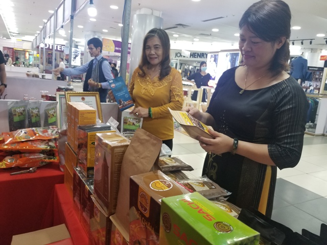 Khách hàng tham quan và mua sắm các sản phẩm cà phê, ca cao tại phiên chợ