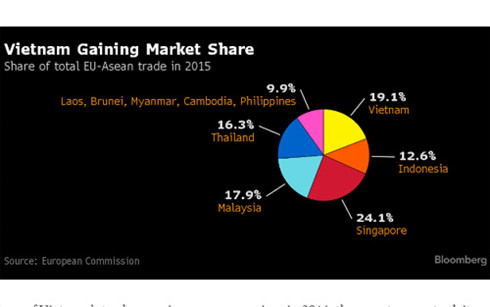 Theo hãng tin Bloomberg, trong năm 2015, Việt Nam đã thành công trong việc chiếm lĩnh thị phần xuất khẩu ở Liên minh châu Âu (EU) từ tay các quốc gia Đông Nam Á khác. Giới phân tích nhận định, xu hướng này có thể sẽ tiếp tục sau khi Việt Nam hoàn tất hiệp định thương mại tự do với EU.