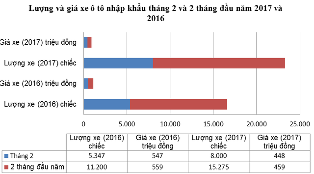Lượng xe nhập của 2 tháng 2017 tăng gấp gần 1,4 lần, riêng tháng 2 tăng gấp 1,5 lần so với cùng kỳ năm trước.
