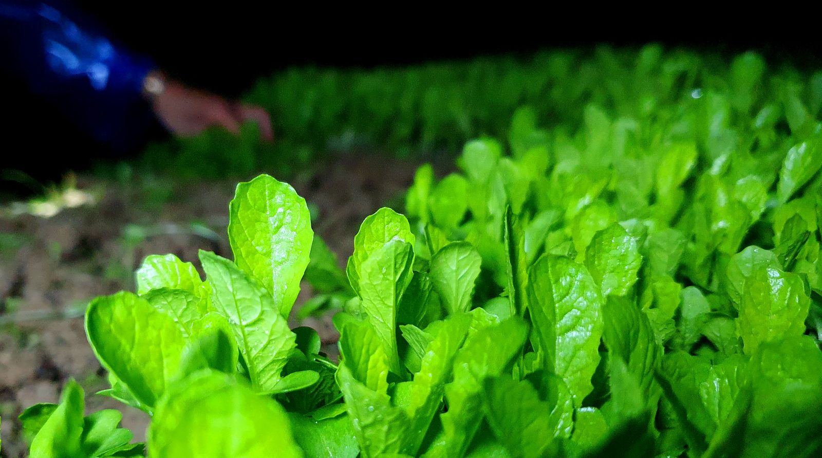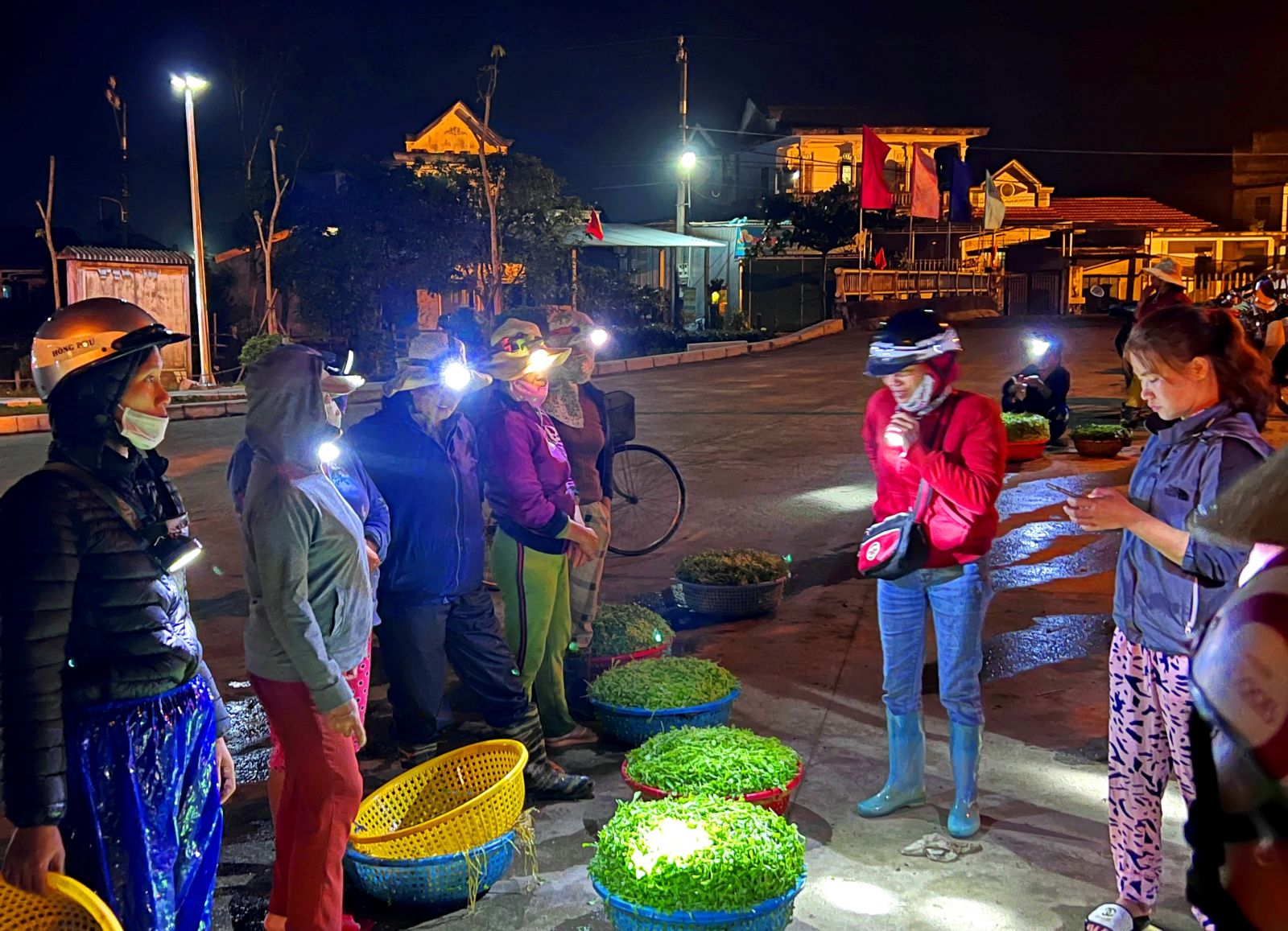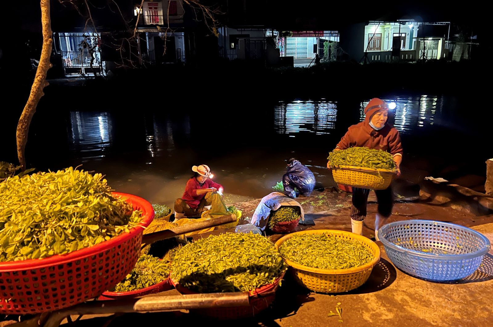 Khuya mùng 2, rạng sáng mùng 3 Tết Nguyên đán Quý Mão, những cánh đồng ở thôn Thành Trung (Quảng Thành, Quảng Điền) loang loáng ánh đèn soi cùng tiếng lách cách từ chiếc kéo nhỏ của nông dân thu hoạch rau.