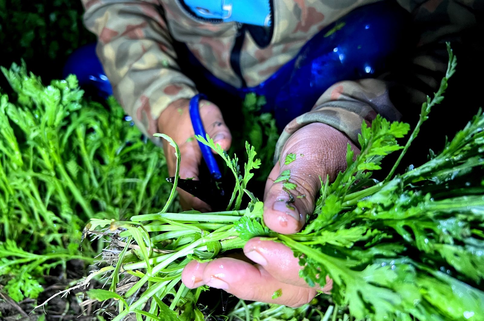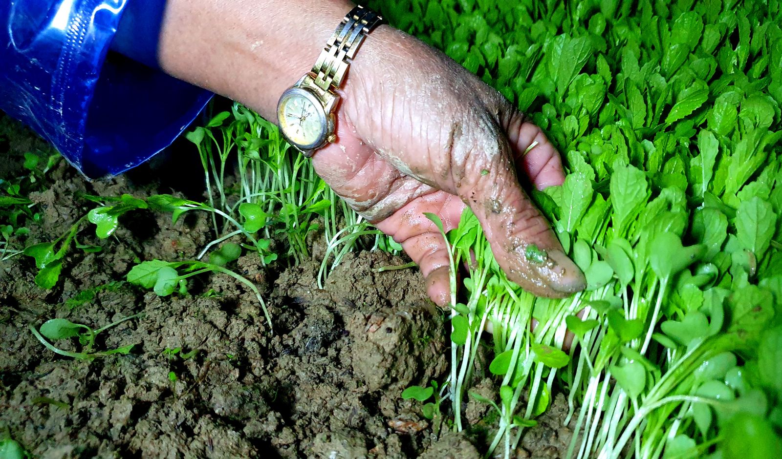 Tùy từng loại rau mà người thu hoạch rau cắt rễ, như tần ô...