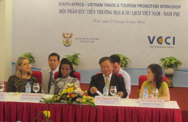 HNN - Sáng 27-11, Chi nhánh Phòng Thương mại & Công nghiệp Việt Nam tại Đà Nẵng phối hợp với Sứ quán Nam Phi tổ chức hội thảo “Xúc tiến thương mại, đầu tư và du lịch Nam Phi - Việt Nam”. Đến dự có các ông, bà Kgomotso Ruth Magau, Đại sứ quán Nam Phi tại Hà Nội; M C Vander Westhuizen, Bí thư thứ nhất Đại sứ Nam Phi; Đinh Khắc Đính, Phó Chủ tịch UBND tỉnh; lãnh đạo các sở, ban ngành và các doanh nghiệp (DN) hoạt động trên lĩnh vực du lịch, thương mại trên địa bàn tỉnh.