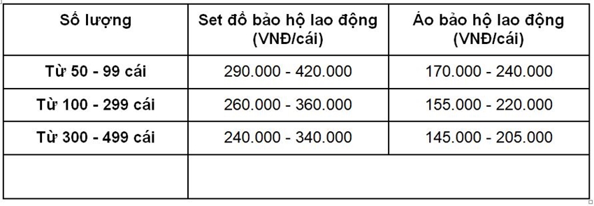 Bên cạnh đó, để đáp ứng nhu cầu đa dạng của khách hàng, xưởng may không ngừng nỗ lực mang đến những sản phẩm chất lượng cao với mức giá cạnh tranh nhất. Dưới đây là bảng báo giá chi tiết về dịch vụ may quần áo bảo hộ lao động tại Dony.