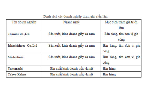Ngoài việc tham gia triển lãm, với sự hỗ trợ của Bộ Công thương Việt Nam, Thương vụ - Đại sứ quán Việt Nam tại Nhật Bản, Cục XTTM, Hiệp Hội Da-Giầy Việt Nam, công ty Forval Corporation… các doanh nghiệp Tokyo sẽ tiến hành đàm phán thương mại với các doanh nghiệp giầy da của Việt Nam nhằm tìm kiếm đơn vị hợp tác gia công, đại lý bán hàng tại Việt Nam.