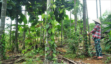 Hộ ông Hồ Đắc Lực cùng thôn cũng được hỗ trợ trồng 400 trụ tiêu. Tận dụng diện tích đất có sẵn, cải tạo vườn tạp, ông Lực đã phát triển thêm 1.000 trụ tiêu bằng gạch, cây mớc. Ông Lực chia sẻ: “Ngoài hỗ trợ giống, kinh phí phân bón, cán bộ kỹ thuật còn giúp bà con tiếp cận cách chăm sóc, ươm tiêu giống sao cho hiệu quả. Các loại phân chuồng, NPK được cán bộ hướng dẫn bón đúng thời điểm, khối lượng khi mới vừa ươm cây giống nên hiện hơn 1.400 trụ tiêu của hộ gia đình đang phát triển xanh tốt”.
