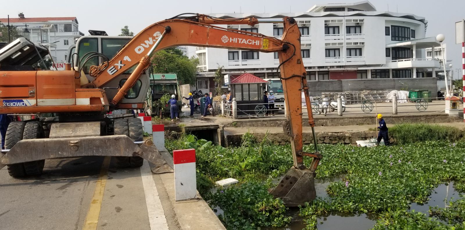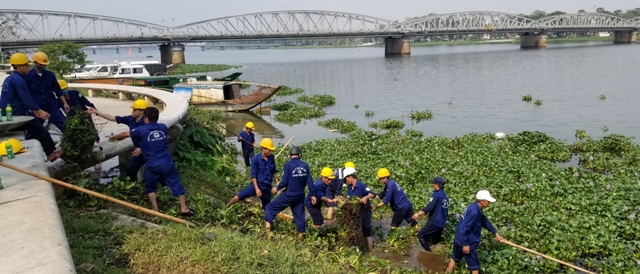 Dọc một số đoạn phía bờ Bắc sông Hương, từ Phu Vân Lâu đến chợ Cồn, phường Phú Cát (dọc đường Trịnh Công Sơn), trên sông Kẻ Vạn... hàng chục công nhân, đò cũng được huy động để vớt bèo tấp lên bờ.